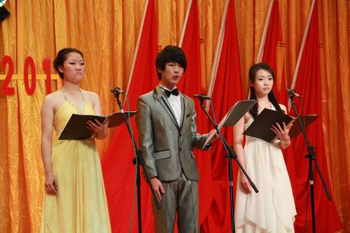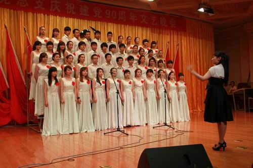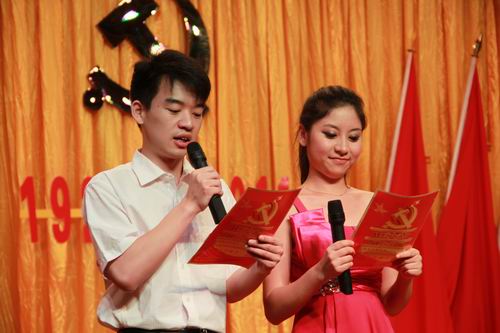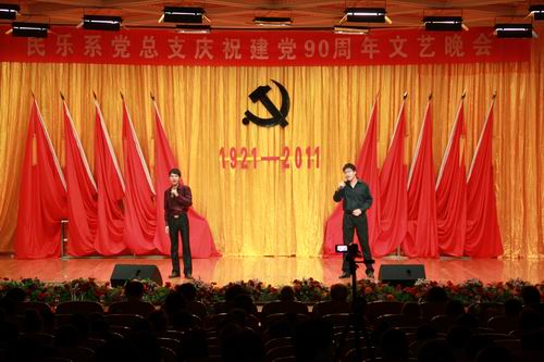 整台晚会共分为“唱响和谐”、“谱写美好未来”两个篇章。教职工支部金伟教授,带领学生激情演绎的二胡齐奏《战马奔腾》博得阵阵掌声,民乐合奏《欢沁》彰显了当代大学生朝气蓬勃的精神面貌;系学生会学生党员代表的庄严宣誓震撼人心,《没有共产党就没有新中国》那铿锵有力的歌声坚定了每一个共产党员的不变信念;诗朗诵《我们不会忘记》让我们重温了那光辉的历史岁月,展现了共产党人的坚强意志,更是让人看到了新一代共产党人勤于耕耘、忠于职守的形象;我系学生第二党支部演绎了歌曲《映山红》《红梅赞》《万泉河水》,再现了一段艰苦卓绝的革命历程和难忘的峥嵘岁月,一首《相亲相爱》唱出了中华儿女的美好心愿;《红歌联唱》中,同学们用耳熟能详的歌曲,共同祝愿伟大的中国共产党强盛不息、光辉永驻。我系学生第一党支部的大合唱《解放区的天》气势恢宏、旋律激昂,表达了在中国共产党的正确领导下,我们伟大的祖国正以崭新的面貌走向繁荣富强。我系学生自发组织了年级之间的拉歌比赛,三年级的《打靶归来》、二年级的《一二三四歌》、一年级的《团结就是力量》精彩的演唱,欢乐的气氛,把整个晚会推向了一个小高潮。随着《祖国啊!我亲爱的祖国》那慷慨激昂的朗诵,一面宽九米的党旗在大厅中移动,同学们纷纷举起双手传递这面红色的旗帜,此时此刻呐喊声、掌声、欢呼声充斥着整个大厅,形成了此起彼伏的红色人浪,那份热烈的激情久久萦绕会场、激荡人心。