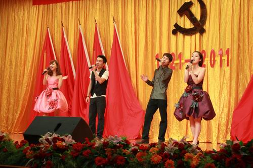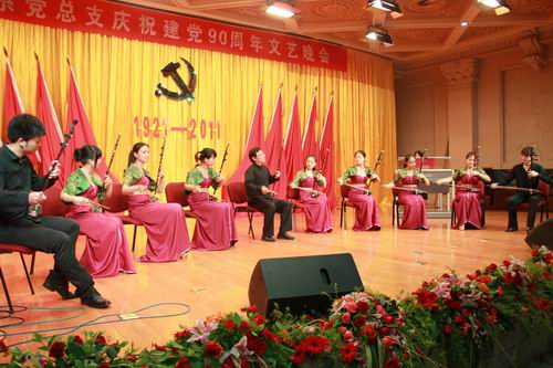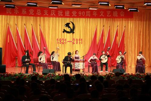 红旗如画,展现光辉历程;岁月如歌,颂唱丰功伟绩。6月30日下午,我院学术厅华灯高照、红歌激扬,民乐系党总支以“永远跟党走”为主题,庆祝建党90周年文艺晚会在学术厅隆重上演。党委委员、副院长白路平老师、65年党龄的前附中校长张巨荣老师、56年党龄的前老院长、前民乐系主任鲁日融、30年党龄的前民乐系主任李长春老师、以及我系26年党龄的总支书记张津波一同观看了演出。
