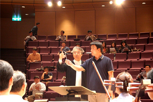 我系三弦教师高伟在香港中乐团学习期间参加了由香港中乐团与香港演艺学院联合主办的阎惠昌指挥大师班,指挥了朱践耳作曲的《黔岭素描》第四乐章——节日与李焕之改编的《二泉映月》。