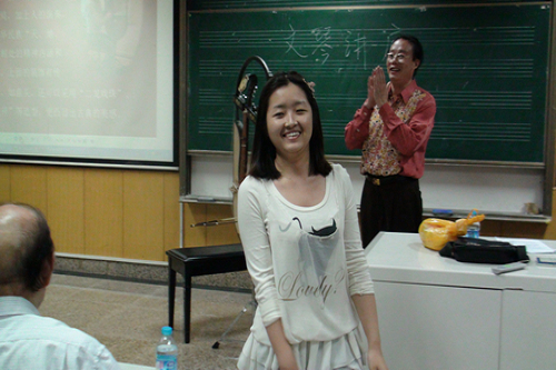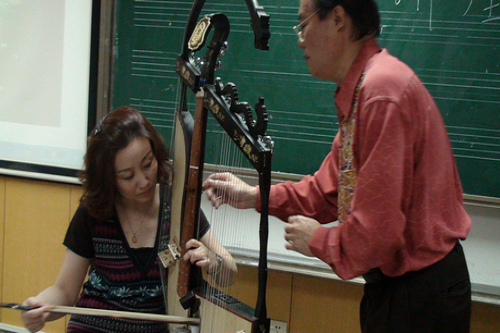 讲座开始,文正球先生简单介绍了文琴的研制背景及过程、文琴的特点以及文琴问世后发展推广的情况。之后,文正球先生用文琴演奏了大家耳熟能详的《二泉映月》,让在场观众感受到了文琴的独特魅力。演奏完后,我系师生纷纷上台,亲自感受了这件新奇又独具特色的乐器。当晚,讲座还带来了由香港陈志诚先生新研制的桐琴,受到好评。最后,鲁日融教授发言,高度评价了改革的新式乐器,对研制人为民族乐器改革发展所做的努力表示了肯定。