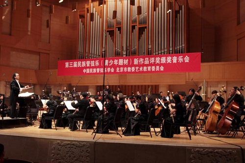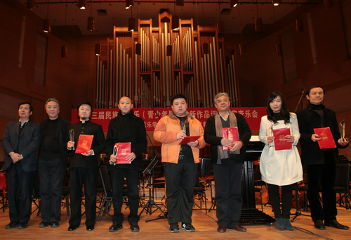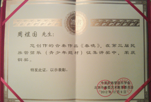 2012年12月9日,中国民族管弦乐学会和北京市教委艺术委员会共同主办的“第三届民族管弦乐(青少年题材)新作品评奖”顺利落下帷幕,并于当晚在北京中山音乐堂举行隆重的颁奖仪式暨颁奖音乐会。我院周煜国副教授的民族管弦乐作品《春晓》荣获铜奖,并应邀赴京出席颁奖音乐会。