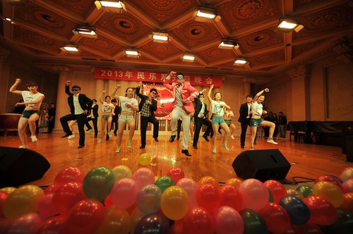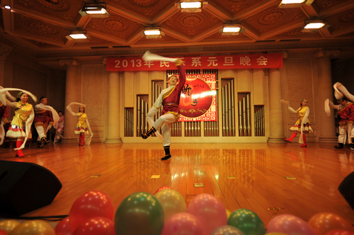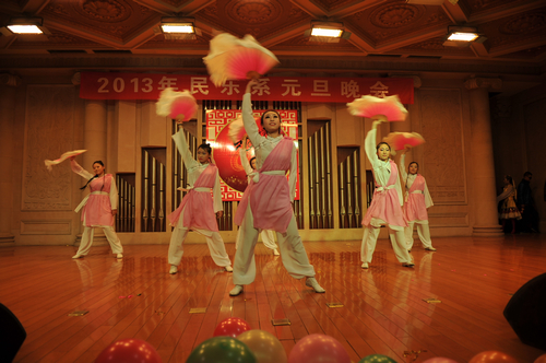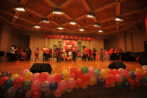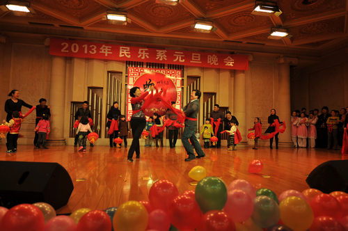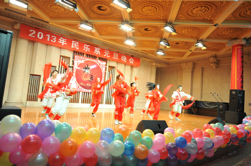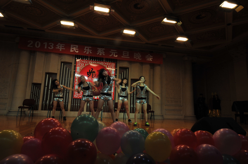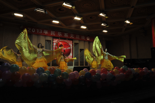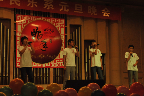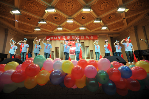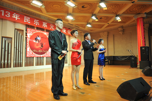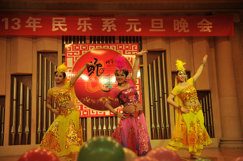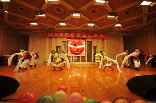 2012年12月31日晚上7:30分,我院学术厅华灯璀璨、欢歌飞扬,大红色的横幅、彩色的气球、红色的的对联“明中华美德教化炎黄儿女,乐人间妙音至善民族大爱”呈现在舞台两侧,热闹的会场座无虚席、笑声连连、掌声阵阵,民乐系的师生和大家欢聚一堂载歌载舞,共同迎接美好的2013年。院党委书记安宁、副院长白陆平、原副院长鲁日融和民乐系的老教师们也观看了晚会,党政办公室主任夏滟洲、干部人事处长文戈、宣传部长杨景鑫、学工部长张鉴担任了晚会的评委。