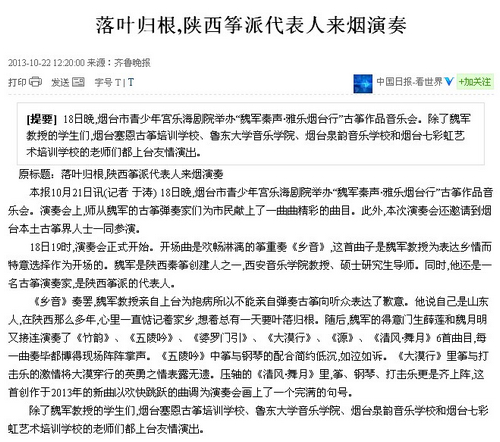 继我系魏军教授与教师们赴四川举行“魏军古筝作品音乐会”后,2013年10月18、19日与我院民乐系教师薛莲、魏月明,作曲系钢琴教师郭芳及陕西省广播电视民族打击乐首席张昭晗共同赴烟台、青岛举办“秦声·雅乐魏军古筝作品音乐会”。