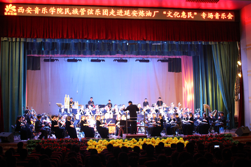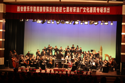 11月2日,全团历时7小时来到陕北延长县七里村采油厂,该厂是中国陆上石油工业的发祥地,中国陆上第一口油井在这里诞生。能为百年老厂送上民族音乐这一精神食粮,也是全团的荣幸,这也是该厂百年来第一次现场欣赏到民族管弦乐,为了演出效果,厂里还派专员到西安购买了多个演出所需的吊麦,确保音响质量。延长油田股份有限公司也高度重视此次惠民演出,总公司工会魏副主席亲临现场,与全厂领导和员工们一起欣赏音乐会。音乐会前,厂里还举行了拉歌,为音乐会营造了热烈的气氛。音乐会上,乐团演奏了《庆典序曲》《红楼梦组曲》《大宅门—芦沟晓月》《长安社火》女声独唱《芦花》、男生独唱《父亲》、《黄土地—石板腰鼓》、二胡协奏曲《长城随想》《赛马》《好汉歌》等乐曲,亲切熟悉的旋律回荡在石油人的心田,欢呼和热烈的掌声,肯定了西安音乐学院民族管弦乐团的演出圆满成功。