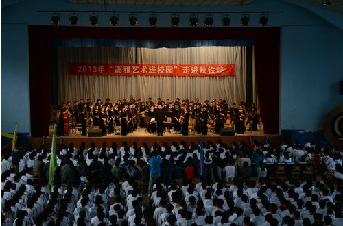 根据陕西省教育厅《关于开展2013年陕西省高雅艺术进校园活动的通知》精神,西安音乐学院民族管弦乐团以百人乐团的阵容,于2013年10月23日、10月24日、10月25日分别为西安高新一中,高新逸翠园学校、陕西铁路工程职业技术学院以“感受经典,陶冶情操,提高修养”为主题,送去了高水平的民族管弦乐音乐会。