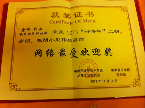 由中国民族管弦乐学会胡琴专业委员会、中央音乐学院民乐系联合举办的2013“兴涛杯”二胡、高胡、板胡小型作品展演决赛,于11月18日在中央音乐学院音乐厅拉开帷幕。我院民乐系金伟教授作曲的二胡独奏《快乐的纺织姑娘》喜获作品铜奖及网络最受欢迎奖。作品由青年教师郭琴星演奏。