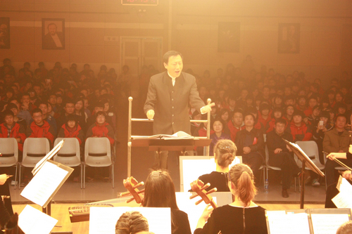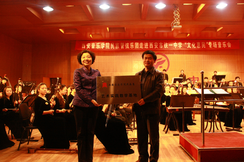 多年来,铁一中为西安音乐学院输送了大批优秀音乐人才,西安音乐学院的专业教师及在校大学生、研究生也多次帮助铁一中的特长生提高专业水平。为了更好地发挥两校的优势,培养现代社会需求的民族器乐创新型人才,经双方友好协商决定在铁一中建立艺术实践教学基地。在当天音乐会开始之前进行的授牌仪式上,民乐系党总支书记张津波亲自将“西安音乐学院民乐系艺术实践教学基地”的牌匾授予铁一中姜书念副校长,为以后开展专业授课、举办文艺演出活动等多方面合作开启了一个良好的开端。随后乐团演奏了《庆典序曲》《大宅门—芦沟晓月》《长安社火》女声独唱《芦花》、男生独唱《父亲》、《黄土地—石板腰鼓》、二胡协奏曲《长城随想》《赛马》《好汉歌》等乐曲,其中由艺术中心主任罗绮指挥的《赛马》《好汉歌》与台下学生互动,收到了良好的反响。