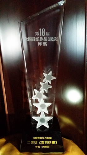 由文化部主办的全国音乐作品评奖是中国文化艺术政府奖——“文华奖”的重要组成部分,也是音乐创作领域的政府奖项。2014年1月,第十八届全国音乐作品(民乐)评奖在北京举行,本次评奖活动共收到全国各地报送的作品287首,其中民族管弦乐作品77首,独奏、重奏及其它组合作品210首。此项评审规格极高,评委均由国内资深专家及业内权威人士组成,经评委认真评审,共评选出获奖作品37首,其中民族管弦乐作品16首,独奏、重奏及其它组合作品21首。