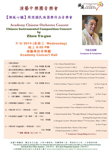 应香港演艺学院邀请,我系周煜国副教授日前赴港担任该院音乐学院中乐系到访艺术家《“雅风心韵”—周煜国作品及指挥》专场音乐会及教学活动。期间,为演艺学院中乐团进行了指导排练及专业(古筝、中阮、竹笛)个别课教学与授课,为该院指挥专业研究生和乐团声部首席做了本次音乐会作品专题指导。在港期间,应邀观摩聆赏了香港“竹韵小集”《香港作曲家作品音乐会》,会晤了香港爱乐民乐团艺术指导/首席指挥何文川先生和团长陈文颖女士,就合作事宜进行了广泛交流。5月7日晚8时,周煜国指挥演艺学院中乐团,在演艺学院音乐厅隆重推出《“雅风心韵”-周煜国民族器乐作品音乐会》。