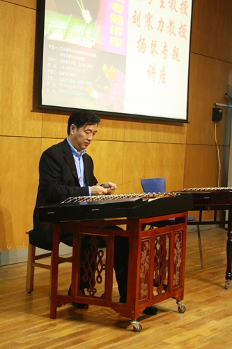 张学生教授讲座的专题是“东北扬琴在东北地区的传统继承,科学发展与未来展望。”他讲诉了东北扬琴的起源,传人,和代表曲目,又对目前东北扬琴发展创新的情况作了介绍,播放了录像,如电扬琴还有锣鼓扬琴等。张学生老师自己发明的双琴竹头演奏工具,特别是双竹头“活动式”这一款式,倍受大家的关注。刘寒力教授讲座的专题是“扬琴音乐创作”就他多年来创作扬琴曲的体会,谈了几点经验,并现场演奏了他创作的曲目。受到了扬琴师生的欢迎。讲座现场,师生交流互动,气氛十分热烈。