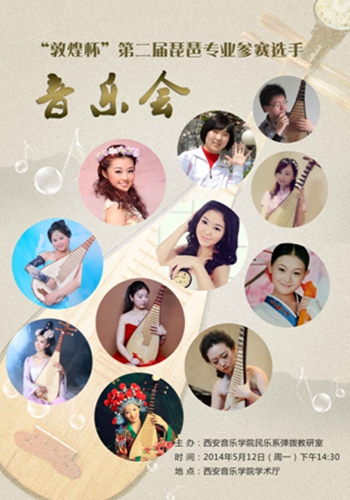 2014年5月12日下午,在西安音乐学院学术厅举办了第二届“敦煌杯”全国琵琶比赛西安音乐学院参赛选手音乐会。此次音乐会由中国民族管弦乐学会琵琶专业委员会主办、西安音乐学院民乐系弹拨教研室以及北京华夏璇音艺术传播中心承办。民乐系系书记张津波、副主任樊艺凤教授、弹拨乐教研室主任任畅副教授、赵静副教授、倪慧娣副教授、段辛老师、宋薇老师到场观摩并指导。