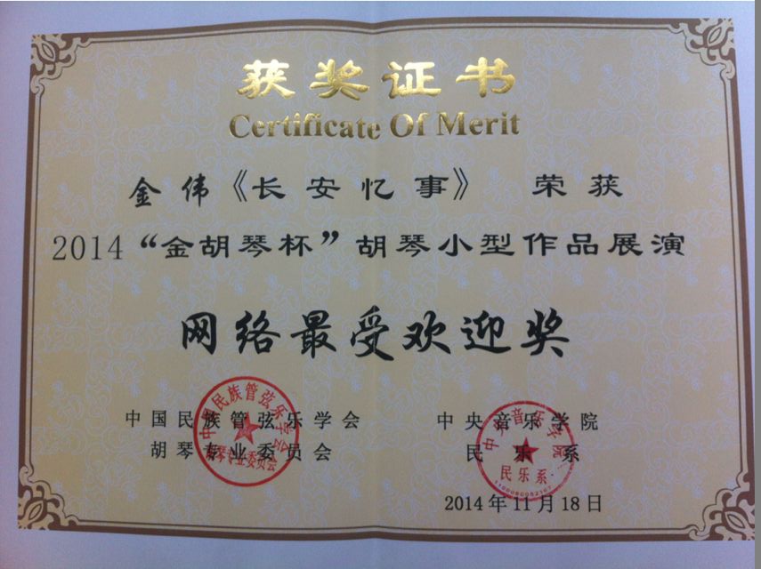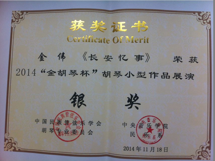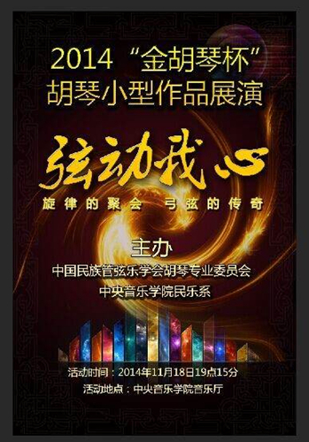 “旋律的聚会,弓弦的传奇”,2014年11月18日晚,由中国民族管弦乐学会胡琴专业委员会和中央音乐学院民乐系联合主办的“弦动我心”——2014“金胡琴杯”胡琴小型作品展演暨决赛颁奖音乐会在中央音乐学院音乐厅隆重举行。我院金伟教授的作品《长安忆事》入围决赛。