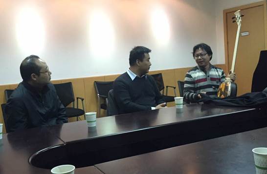 2015年11月6日下午,原我系三弦教师王兴印之子,三弦演奏家王学辉先生携新型三弦来到民乐系进行乐器改革座谈会,民乐系书记张津波,三弦教师高伟,陕西省演艺集团三弦演奏家何经田、陕西省戏曲研究院三弦演奏家欧杰、及民乐系三弦学生们参加了此次交流。