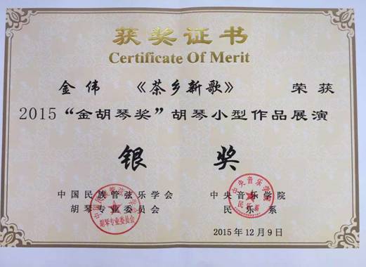 由中国民族管弦乐学会、胡琴专业委员会、中央音乐学院民乐系主办的2015“金胡琴杯”小型作品决赛于2015年12月9日在中央音乐学院音乐厅圆满结束,我院金伟教授的二胡独奏作品《茶乡新歌》荣获银奖。