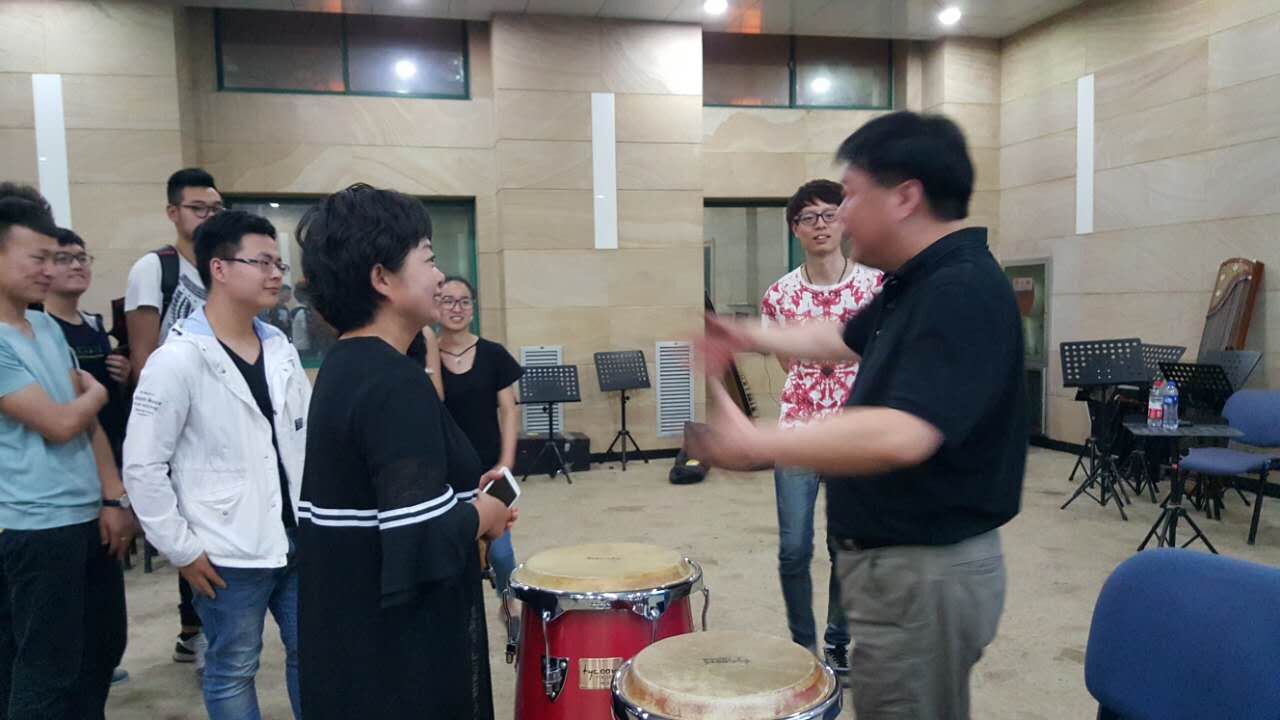 在问答环节中,有学生提出了关于康佳鼓的打法问题,阿棋老师对其进行了现场指导,最后他告诉学生们要想打好打击乐,除了天赋以外,要有不拍疼、不怕苦的练琴精神。