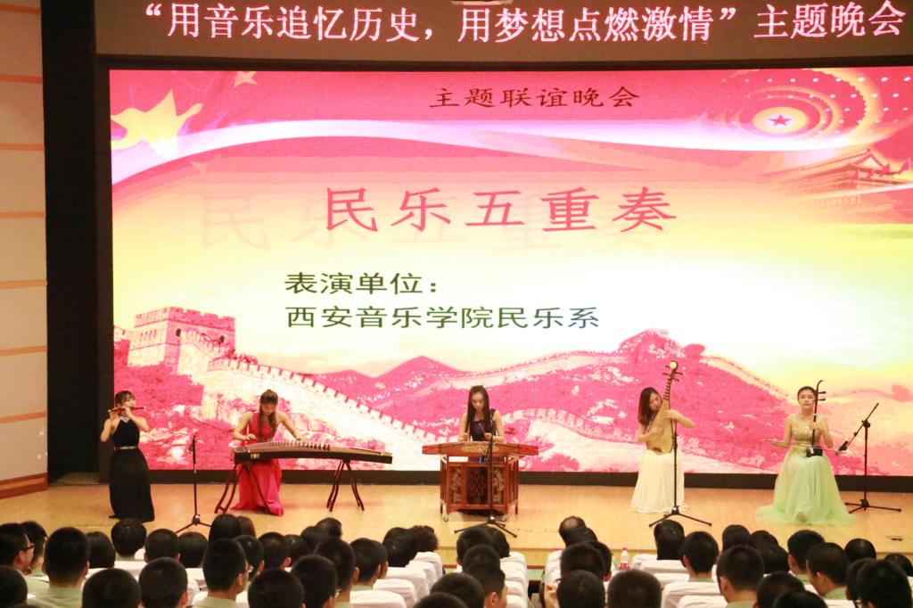 晚上8时许,民乐系学生和二旅学员“用音乐追忆历史,用梦想点燃青春”主题晚会将本次活动推向高潮,民乐系学生表演了笛子独奏、唢呐独奏、古筝重奏、琵琶重奏、民乐五重奏等节目,充分展示了我系学生的风采。二旅学员以音乐剧、小品、相声、舞蹈等多种形式展现出当代军校学员的精神风貌,晚会在全场师生共唱《走向复兴》中落下帷幕。