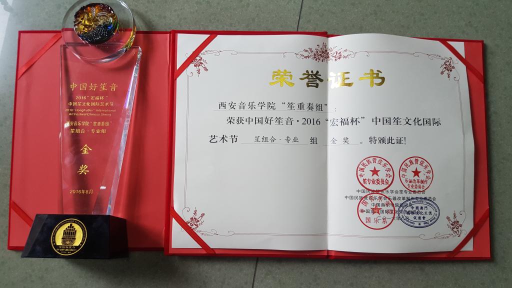 参赛方有中国音乐学院、中央音乐学院、上海音乐学院、武汉音乐学院、四川音乐学院等多家兄弟院校及艺术团体500多位选手参加。西安音乐学院笙重奏组(键笙Ⅰ:韩世子,键笙Ⅱ:许霞霞,中音笙Ⅰ:孟红升,中音笙Ⅱ:王春壬,低音笙:张志强)通过初评、复赛、决赛,成功诠释《山丹丹开花红艳艳》(冯季勇移植)、《塬》(龚佩燕作曲)、《序曲》(张晓峰作曲)三首作品,最终荣获金奖,为我院赢争了荣誉。排练指挥:侯颉、高伟,艺术指导:赵鸿宾(优秀指导教师奖)。