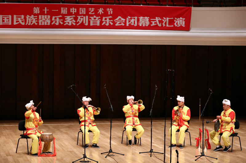 作为系列音乐会的重头戏,10月28日晚,“2016全国民族器乐系列音乐会闭幕式汇演”在我院艺术中心举办。闭幕式汇演分为上下半场,上半场由陕北大唢呐常家班的《大摆队》拉开序幕。此外,上半场鼓吹类乐种还上演了山西晋北鼓吹《三对面》、辽宁复州鼓乐《龙舞丰年》。陕北大唢呐是黄土高原上最具代表性的民间乐器之一,组合多为五人,故称为老五班,五名民间艺术家腰系红绸,头带白毛巾,无论是扮相还是大唢呐音调,都极具陕北地域特色。晋北鼓吹《三对面》是北路梆子《打宫门》中的一折,讲的是明代李艳妃大义灭亲,敦促重臣徐彦昭、杨波挺身除奸、共扶幼主的故事。演奏者为晋北鼓吹忻州八音艺术团。其巧妙运用乐器音色特点,惟妙惟肖的移植了北路梆子传统唱腔,独具匠心,另据风采。而辽宁复州鼓乐的表演,刮起了一阵猛烈的“东北风”。《龙舞丰年》的创作是在复州鼓乐传统曲牌的基础上,吸取了东北民间音乐素材,表现了喜获丰收的农民欢天喜地迎佳节的欢快心情。其曲调高亢活泼,体现了东北人热情豪爽的性格特点。