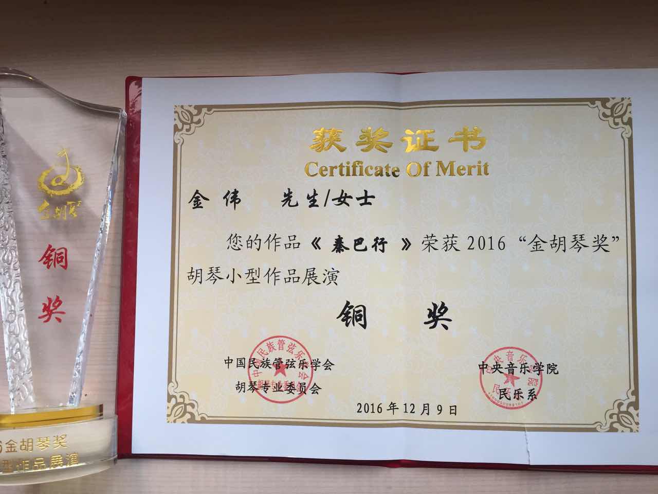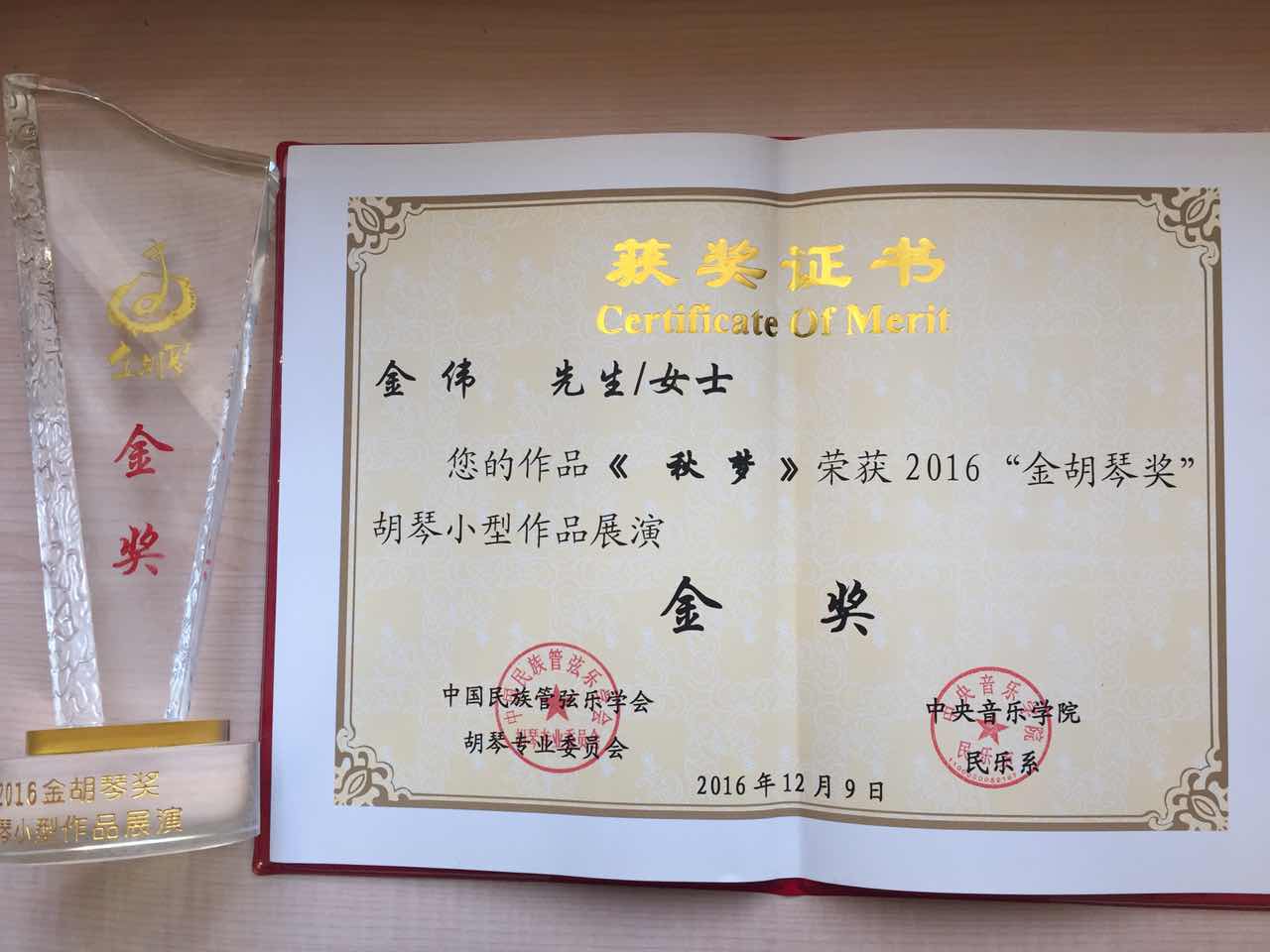 2016“金胡琴奖”胡琴小型作品比赛于12月9日在中央音乐学院歌剧音乐厅落下帷幕。此次活动由中国民族管弦乐协会胡琴专业委员会、中央音乐学院民乐系联合主办。从海内外近百首作品中评出58首进入半决赛,之后从58首作品中选出18首入围最后的决赛。我院金伟教授的两首作品入选进京,民乐系青年教师郭琴星、李振中分别担任独奏和伴奏。两首作品均得到了专家评委的高度赞扬,《秋梦》最终一举斩获金奖,而《秦巴行》也获得了铜奖的优异成绩。