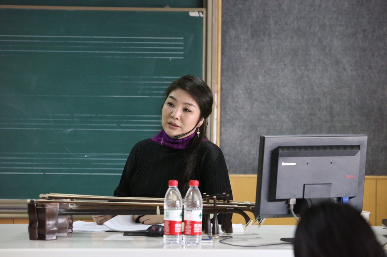 在上午的学术讲座中,宋飞教授以“用音乐点亮生命的光彩——二胡无伴奏套曲《如来梦》的演奏诠释与教学实践”为题,以理论讲解与演奏示范相结合的方式,深入的剖析了刘文金先生的《如来梦》套曲。不仅将乐曲的创作背景、音乐语言、内容表现、情感表达等方面讲解得细致到位,还处处透着宋飞教授对音乐艺术的思考和她的教学及演奏理念。示范演奏的谭欣同学基本功扎实,演奏收放有度,体现了宋飞教授的教学实力,也反映出中国音乐学院顶尖的教学水平。