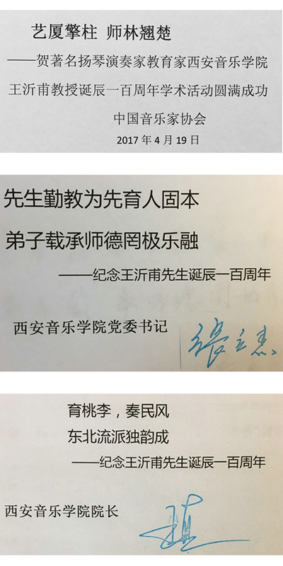 先生百年诞辰纪念活动得到了中国音乐家协会、陕西省文化厅和学校党政的高度重视和大力支持。先后有数十家单位和近百人为先生百年诞辰题词,以表对先生的无尽思念和缅怀。如中国音乐家协会为先生百年诞辰所题:“艺厦擎柱,师林翘楚”;中央民族大学教授、中央音乐学院客座教授高增培为先生百年诞辰所题:“东北扬琴尊泰斗,西出长安桃李香”。如先生学生、西安音乐学院刘达章教授所言:王沂甫先生的一生,是贡献于扬琴艺术教育事业的一生,回顾先生对扬琴艺术事业的继承与发展,就是要继续开拓创新,为更好的培养出扬琴艺术优秀人才,为中国扬琴艺术更大发展再谱新篇章。如先生学生、四川音乐学院潘广德教授所言:王老师学识渊博,平易近人。认识他的人,都会感觉到他的谦和慈祥。他的坦诚真挚。我和他的接触交往中,无论书房谈心,郊外漫游或书信往来,王老师都会言传身教,使我受益不少。我总感到老师的品格、学识,像和煦的春风一样,吹拂着让人在不知不觉中感受到他的美,他的力量,受到感染和影响。如先生的学生、厦门大学赵艳方教授所言:毕业以来一直遵继先生的教导,坚守中国扬琴的教学与研究,如先生那样传道、授业,这份责任让我感到心里的分量,已超越一般意义上音乐教育。如先生的学生、陕西省榆林市群众艺术馆研究馆员宋建栋所言:他像慈父般关注着我们的成长,经常对我们进行思想品德教育,教导我们老实做人,诚实做事。他治学严谨,教学认真,像园丁呵护幼苗一样,精心培育我们,对我们充满希望。
