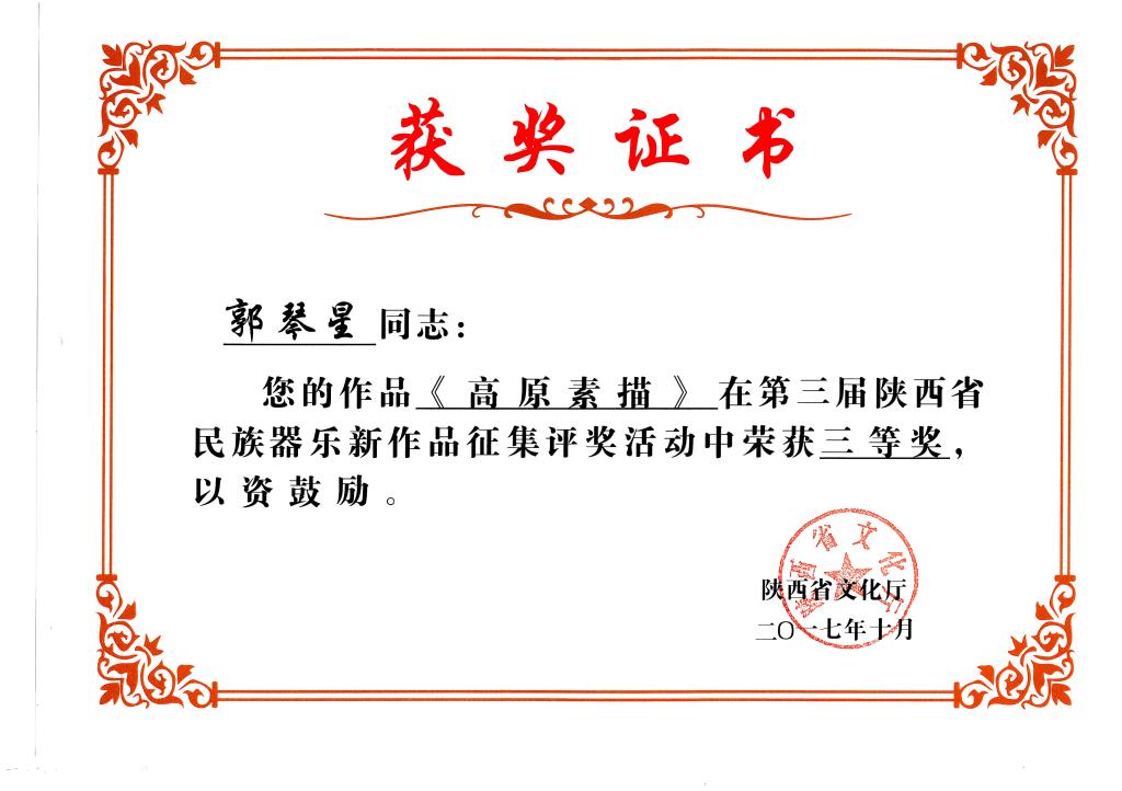 据陕西省文化厅陕文艺(2017)30号文件,陕西省文化厅公布了陕西省第三届民族器乐新作品政府奖征集评奖获奖名单。我校民乐系青年教师郭琴星创作的二胡独奏《高原素描》获得三等奖。
