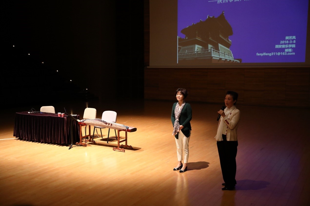 次日,在香港演艺学院赛马会演艺剧院中,樊艺凤教授举办了专场学术讲座,为大家详细讲解了陕西流派的历史和发展过程,以及陕西筝曲的风格特征及演奏技法解析。此次讲座由演艺学院著名古筝演奏家许菱子教授主持,在讲座中,樊艺凤教授结合历史与现实,生动讲解了秦派筝乐的发展历程,并通过现场演奏陕西筝曲代表作《秋夜筝》、《姜女泪》等,使陕西流派的风格和技法要领得以明确展现。讲座获得了在场观众的一致认可。
