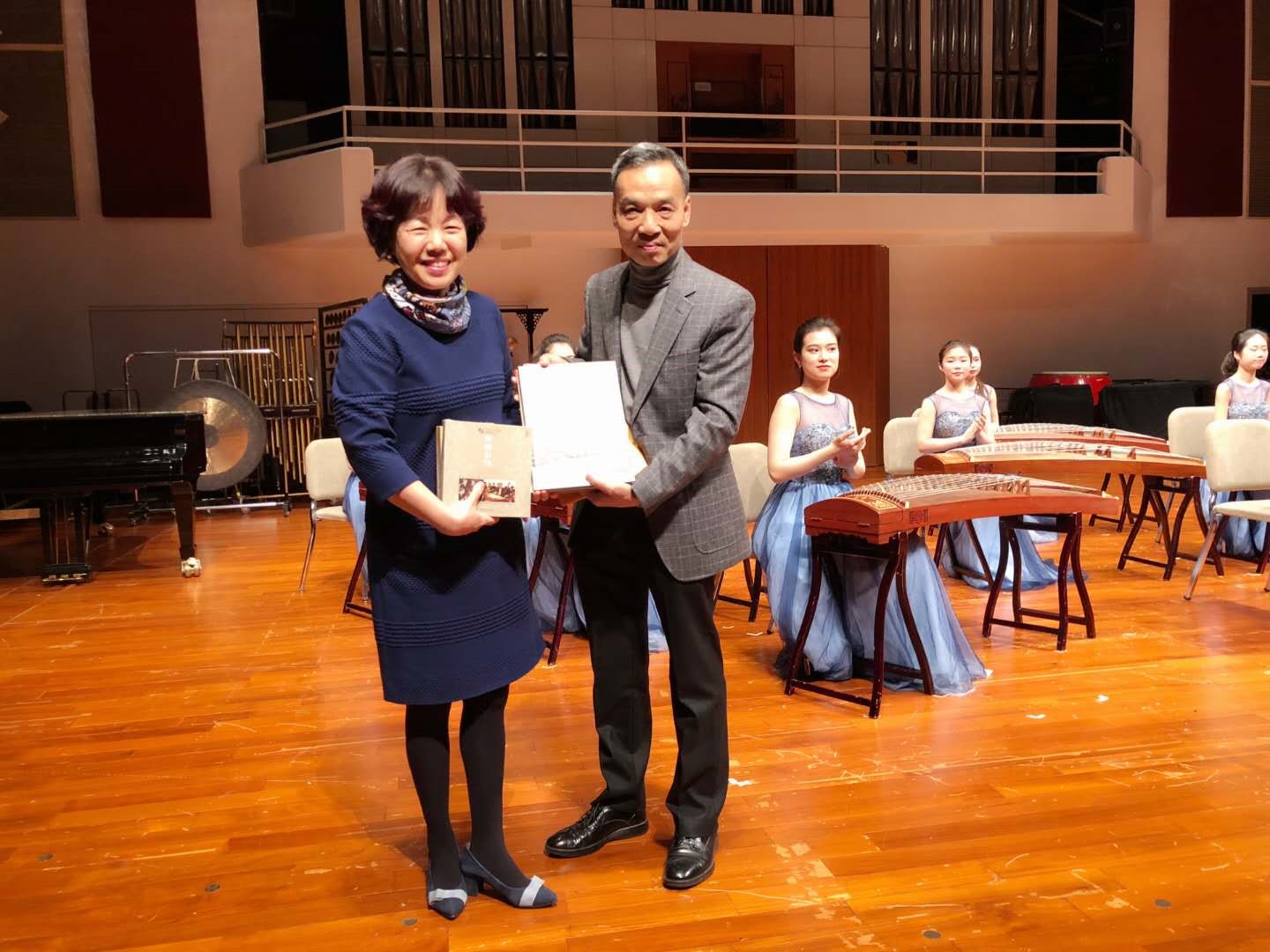 本次活动分为两个部分——“秦风港潮筝争鸣”筝乐专场音乐会和樊艺凤教授的“秦风古韵——陕西筝曲风格特征及演奏解析”学术讲座。在演出开始之前,演艺学院中乐系主任、著名潮乐演奏家余其伟先生与樊艺凤教授代表两院互赠音像、书谱礼物!