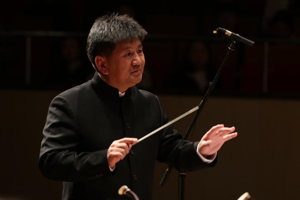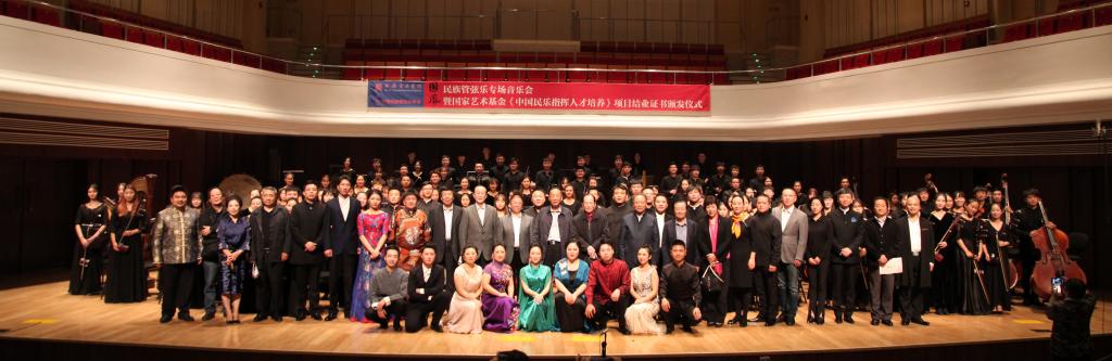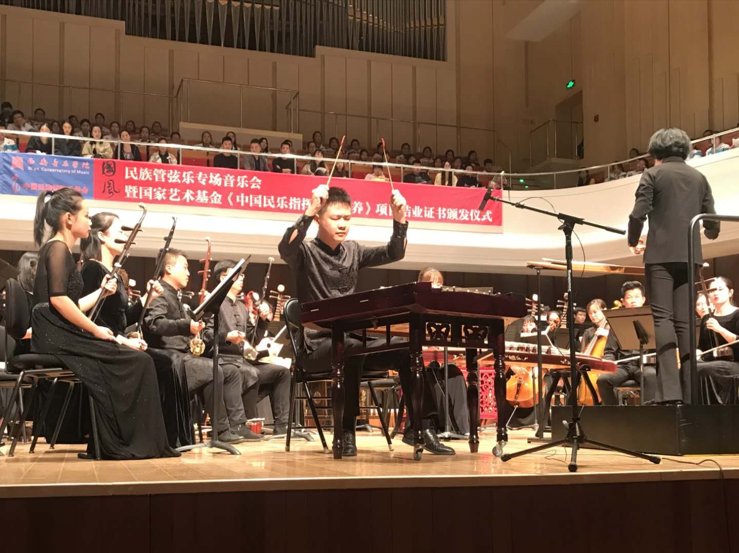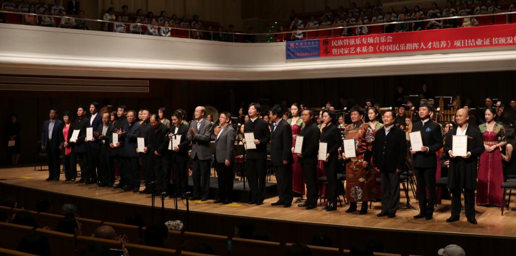 10月9日晚,西安音乐学院艺术中心隆重举办“国风—民族管弦乐专场音乐会暨国家艺术艺术基金项目《中国民乐指挥人才培养》结业证书颁发仪式”。音乐会由西安音乐学院和中国民族管弦乐学会共同主办,西安音乐学院民乐系和艺术实践处协办。西安音乐学院党委副书记刘正利、副院长冯力斌、安金玉、中国民族管弦乐学会会长刘锡津、副会长王书伟、著名指挥家张列、音乐教育家鲁日融、音乐理论家乔建中、打击乐艺术家安志顺等业内专家出席了本场音乐会。