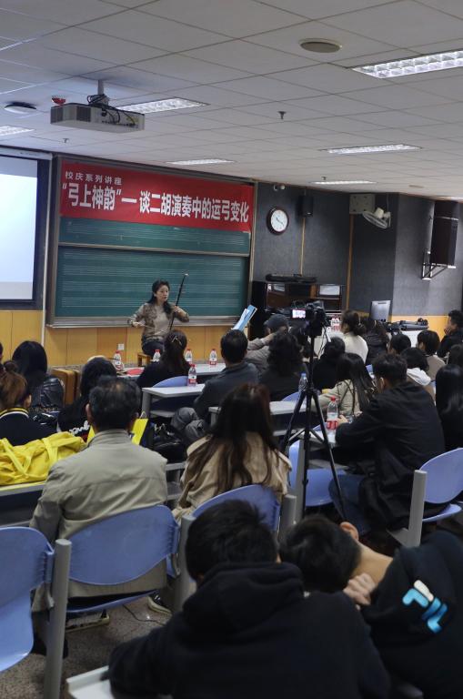 这次讲座主题主要简述运弓技巧的基本要求与要点,并且通过现场示范更进一步的让同学们了解运弓变化的重要性以及演奏中运弓的变化。语言诙谐幽默,通过生动形象的事例以及选取的作品范例更加细致而全面的阐释了运弓的重要性。朱江波老师说到,运弓的着力重心位置应随着音乐所表达的内容、形象的不同而加以变化,这样演奏出来的音色才有立体感,并且生动而富有变化。接着,朱江波老师现场指导示范教学的曲目为《汉宫秋月》、《雪山魂塑》,独特的音乐处理使这两首作品音乐风格异常清晰,同时也体现出朱江波老师独具特色的教学模式,使前来观摩与学习的我院师生受益匪浅。