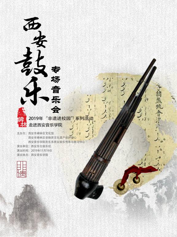 2019年11月19日晚七时,“民间与学院的对话——2019年西安鼓乐进校园系列活动”专场音乐会于我院成功举办。本次活动由西安市碑林区文化馆、碑林区非物质文化遗产保护中心、民乐系西安鼓乐传承与教习中心主办。乔建中、程天健、高纯华、张亚楠等几位老师出席此次活动。