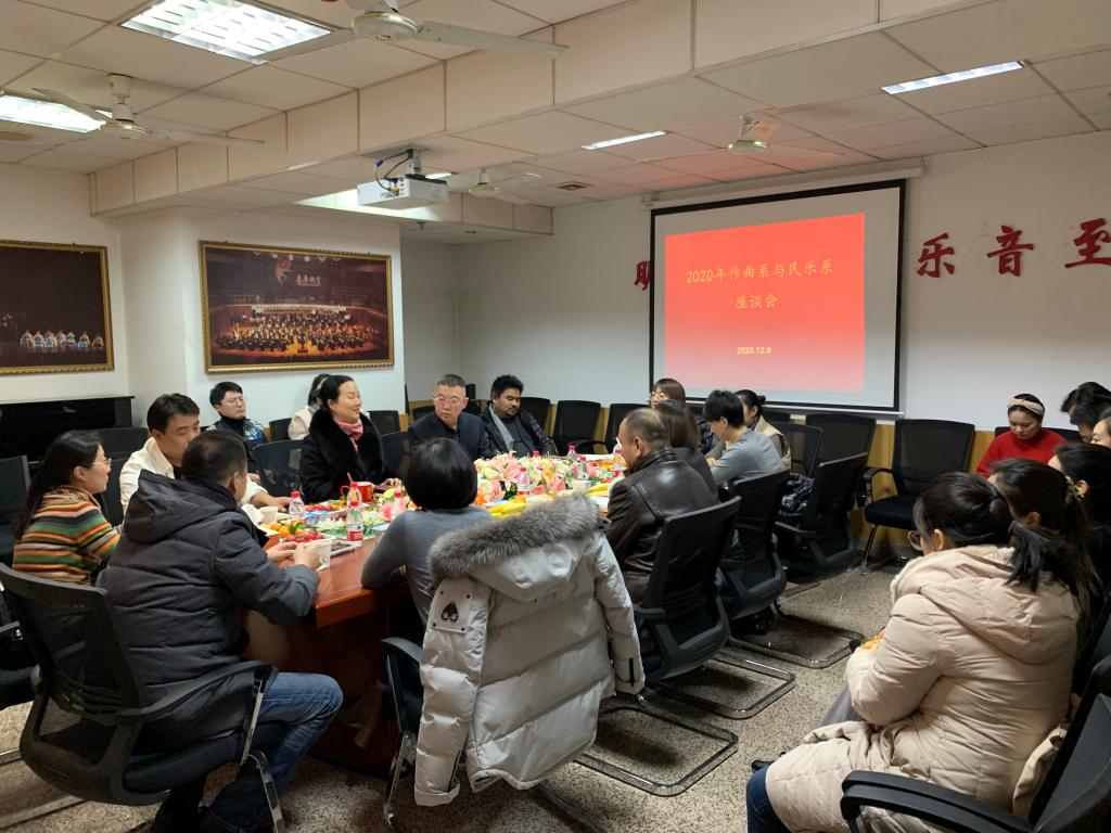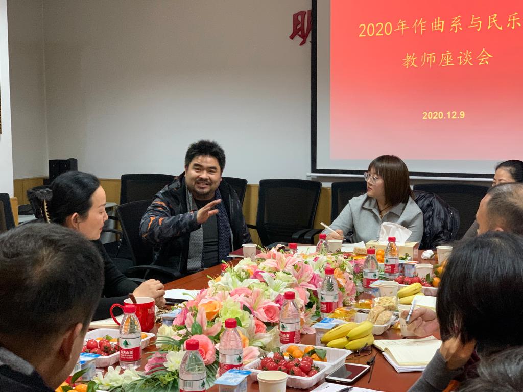 2020年12月9日下午,为加强校内合作,探讨民族器乐曲的发展趋势,我系与作曲系主任王高飞,副主任吴延、冯季勇等五人组成的教师代表,于系会议室召开了座谈会。系主任呼延梅文主持会议,书记王炜,全体领导班子,各教研室相关负责人及青年教师代表参加了座谈会。