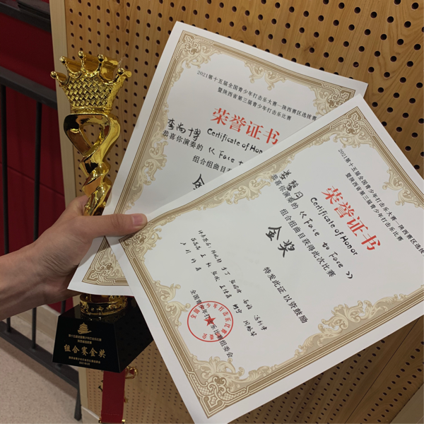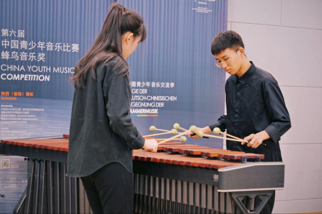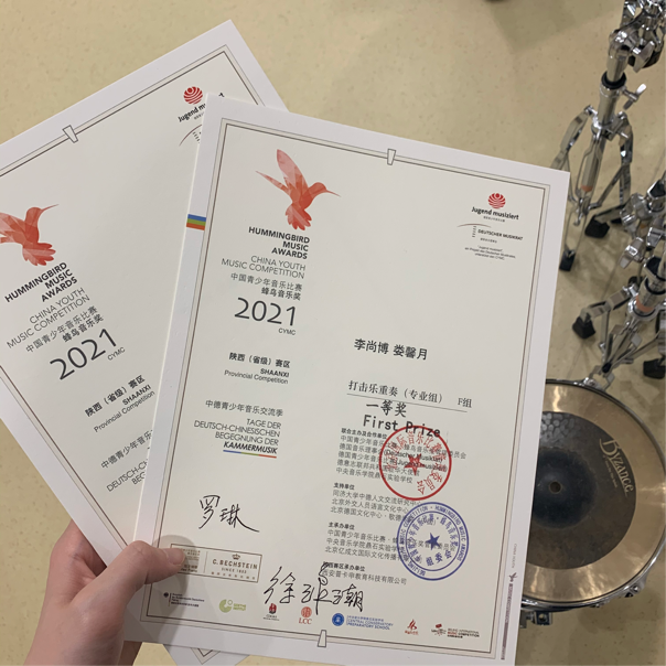 另外,在2021年5月29日举办的第六届中国青少年音乐比赛(CYMC)·蜂鸟音乐奖-陕西赛区省级比赛中,娄馨月、李尚博同学以《2+1》、《face 2 face》两首曲目获得打击乐重奏(专业组)一等奖的好成绩。这是陕西赛区的首届比赛,所有青少年音乐家们对登上这个舞台充满期待。CYMC是一个陪伴青少年成长的音乐教育项目,通过3年循环一次的比赛科目,引导学生从独奏逐步学会聆听他人,并参与到不同室内乐合作演奏的过程,为更好的理解音乐,享受音乐,提高自身的音乐素养提供了锻炼实践的平台。两位同学在此次比赛中获得一致好评。