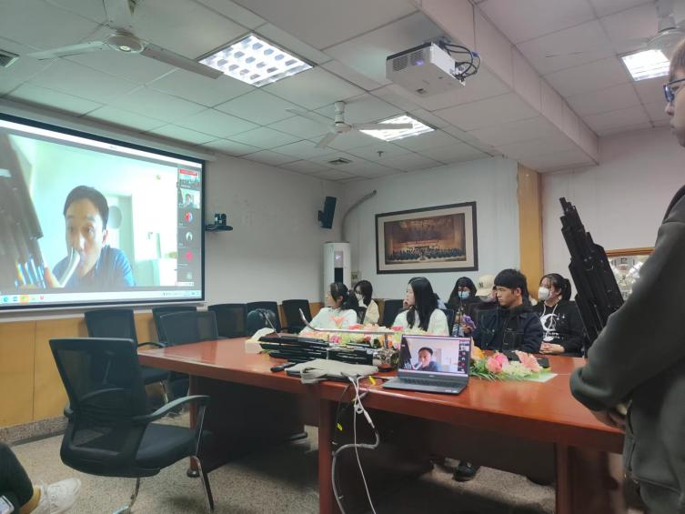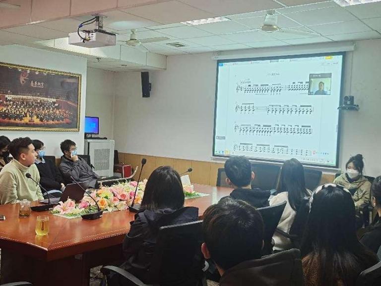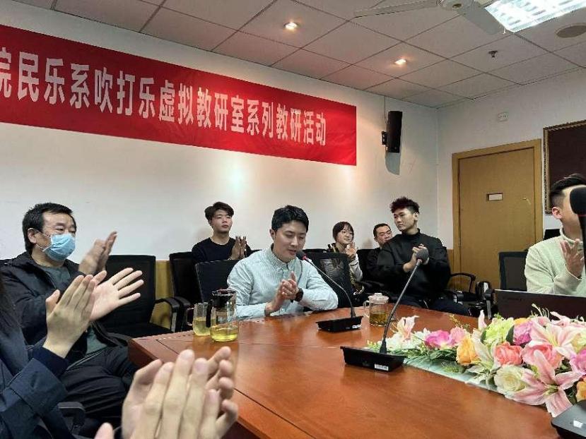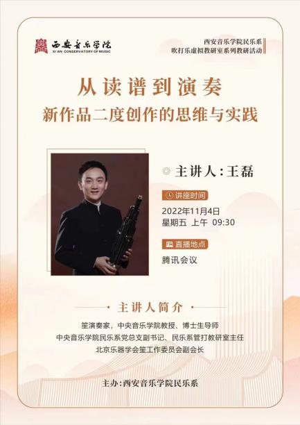 2022年11月4日上午9点30分,“西安音乐学院民乐系吹打乐虚拟教研室系列教研活动”第一场讲座在线上举行。本场讲座特别邀请到中央音乐学院王磊教授担任主讲人。民乐系特地将在校的吹打乐同学集中在会议室利用虚拟会议系统进行学习,从而使线上讲座达到最优效果,西安音乐学院民乐系吹打教研室主任赵逊担任讲座主持人,民乐系吹打教研室全体教师出席活动。
