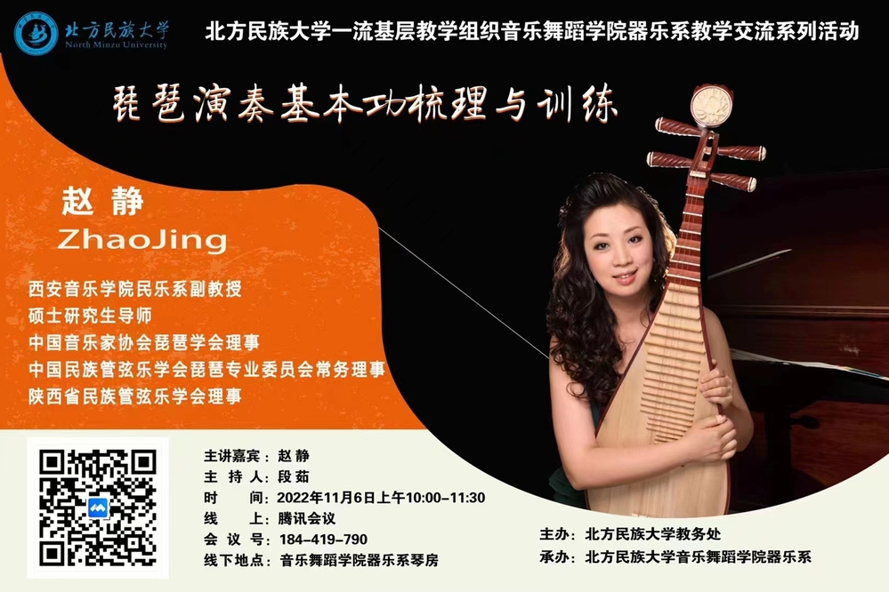 2022年11月6日由北方民族大学教务处主办、北方民族大学音乐舞蹈学院器乐系承办的一流基层教学交流活动成功举办。本次活动在线上进行,特别邀请我院民乐系副教授赵静老师主讲,北方民族大学音乐舞蹈学院琵琶、中阮专业副教授段茹老师主持讲座。