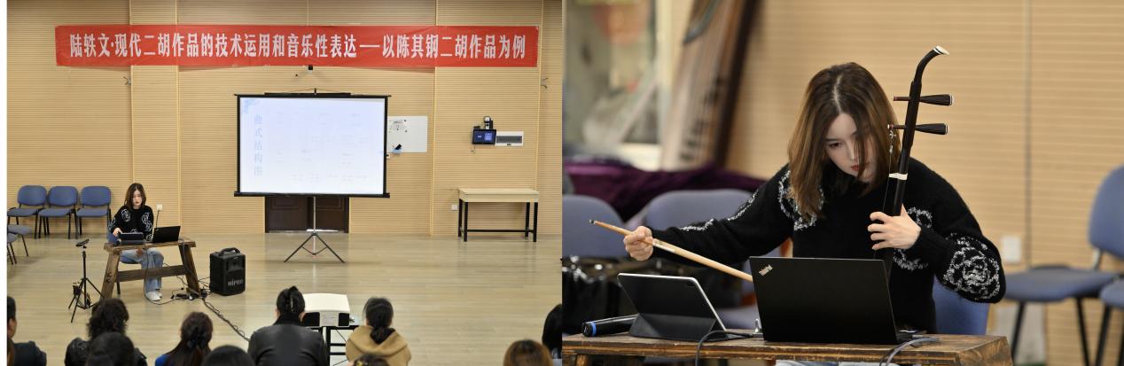 2025年11月13日下午2:00, 青年二胡演奏家、上海音乐学院陆轶文老师应邀来我校,举办了题为《现代二胡作品的技术运用和音乐性表达——以陈其钢二胡作品为例》专题讲座。