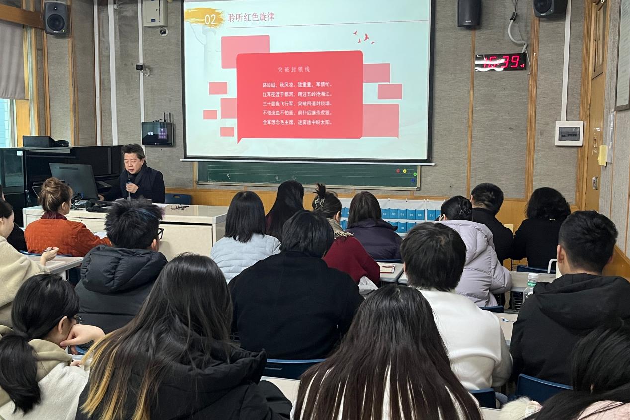 音乐赏析环节中,陈勇副院长精选十部经典红色音乐作品,涵盖民乐合奏、川江号子等多元艺术形式,带领师生沉浸式感受红色旋律魅力。画面中,演奏者身着军装、神情坚毅,以饱满情感传递出长征路上军民同心、生死与共的鱼水深情。结合音乐专业特点,他从曲式结构、音色运用、情感表达等维度细致解析作品内涵,引导师生探寻旋律走向与历史场景的内在联结,让大家在艺术熏陶中感悟革命先辈的理想信念,更明晰民乐艺术在传承红色文化中的独特价值与使命。