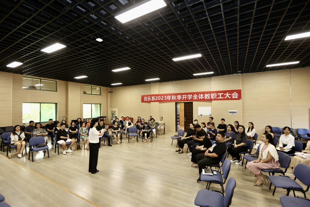 哈书记总结了上学期民乐系取得的各方面成绩,介绍了新入职教师。要求新入职教师要将师德作为从师第一课,所有教师要把师德作为终身必修课,以良好的师德师风影响和带动学生;今后工作中要增强团队意识、开拓创新,凝聚育人合力,团结协作,推动民乐系的发展。呼延梅文主任传达了新学期学校的工作安排,对民乐系重点工作进行了部署,强调了教育教学评估的重要意义和安排,要求全体教师高度重视提前准备;班子成员结合分管工作从教育教学、艺术实践和学生管理等方面分别进行了总结和安排。