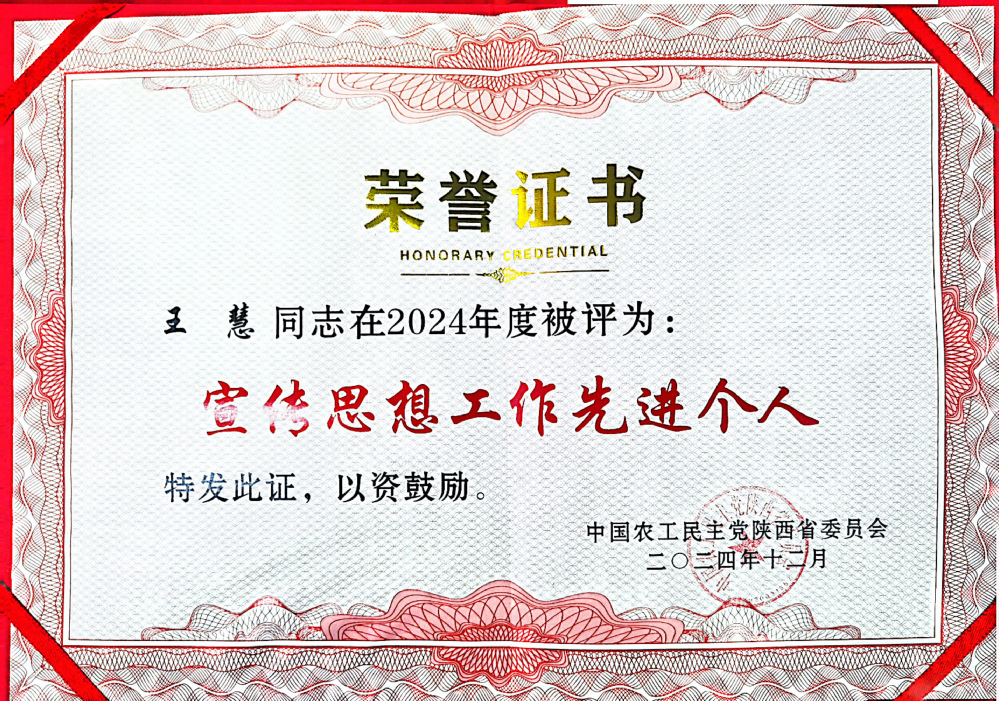 会议学习了习近平总书记系列重要讲话精神、党的二十届三中全会精神和中央经济工作会议精神,传达学习了农工党十七届三中全会精神,审议通过了《中国农工民主党陕西省第八届常务委员会2024工作报告》等报告,表彰了2024年度先进集体和先进个人。农工党陕西省委直属文艺支部主委、我系教师王慧被农工党陕西省委员会评为“2024年度宣传思想工作先进个人”并予以表彰。