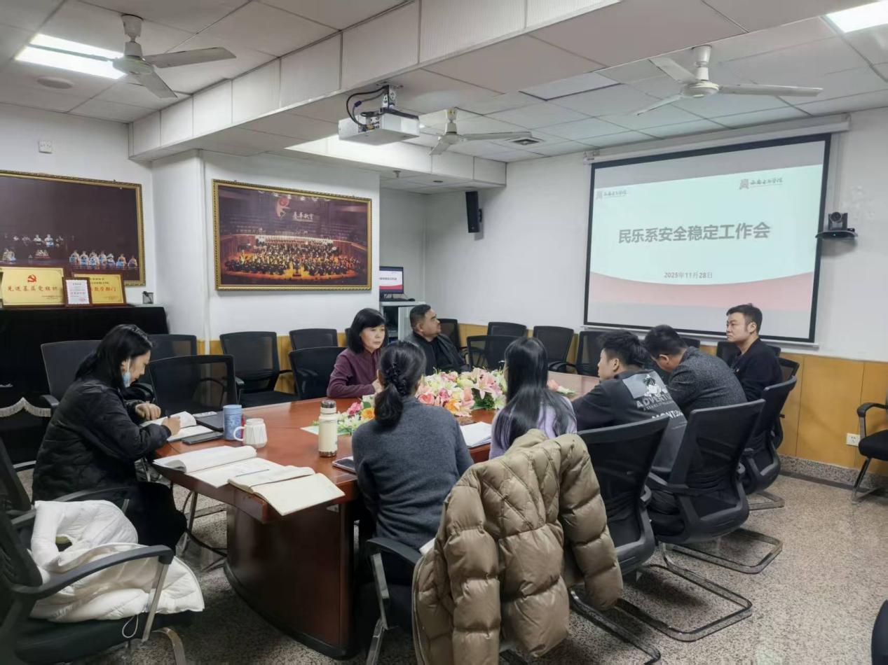 11 月 27 日上午,民乐系召开校园安全工作部署会。会议专题传达学习学校安全稳定工作会议精神,结合冬季校园安全工作特点,着重强调消防安全、财产安全、学生心理健康等重点领域防范工作的极端重要性。针对教学与生活关键区域安全管理,会议进一步明确教学区域、学生宿舍全面禁烟要求,细化各专业教师琴房及公共琴房的卫生保洁标准与财产安全管理规范,部署全体师生全面开展琴房、宿舍卫生清洁与安全隐患自查自纠工作,以“全覆盖、无死角”的排查要求筑牢校园安全第一道防线。