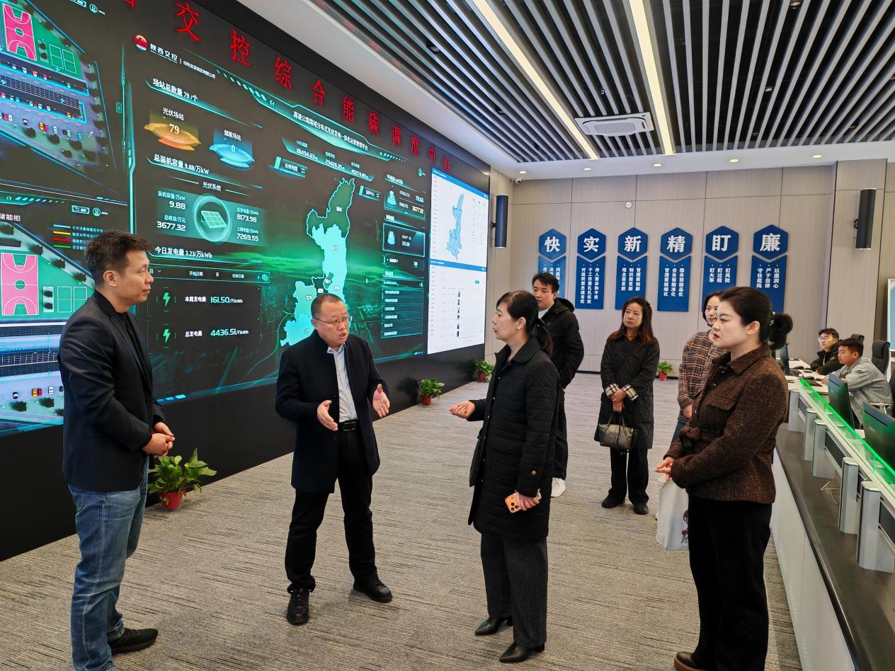 当天上午,考察团首先抵达陕西交控综合能碳调度中心,陕西交控绿色发展集团有限公司总经理解瑞松、绿发智能科技公司副总经理秦强热情接待,并为考察团进行详细讲解。考察团一行认真了解企业发展布局、运营管理模式及绿色发展理念,直观感受陕西交控集团在交通运营、智慧管理、绿色发展等领域的雄厚实力与创新成果,为后续校企合作对接奠定了坚实基础。
